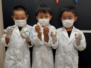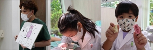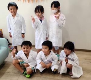 7月28日、8月4日の計2回3名ずつのこどもはいしゃさんに集まってもらい、むし歯の治し方を勉強した後普段は触ることの出来ない実際の治療器具を触ってもらい、はいしゃさん体験をしてもらいました。